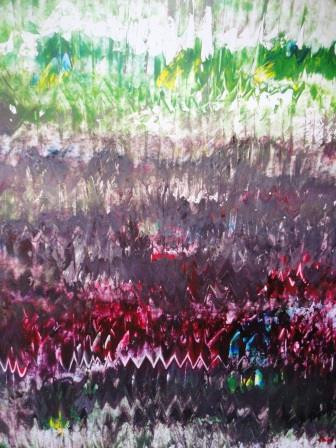 wherein gem-like impressions are formed via displacement of paint either by force or gravity.